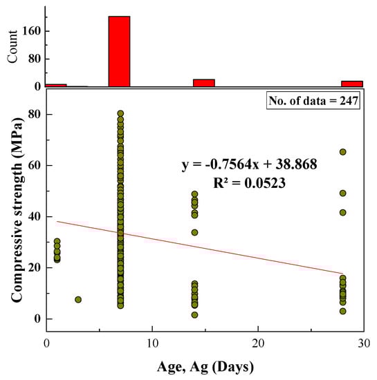 The age of the tested samples from the collected datasets ranged from 1 to 28 days, with an SD and variance of 5.55 and 30.81, respectively, with kurtosis of 6.76 and skewness of 2.69. The relationship between age and CS and a histogram of age are shown in Figure 14.