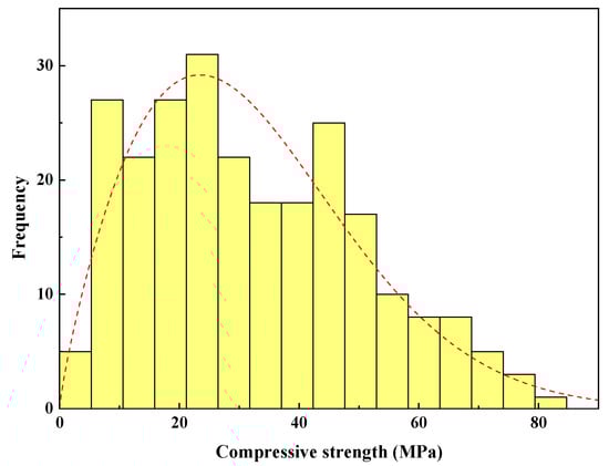 Based on the collected data from the literature, summarized in Table 1, the compressive strength ranged from 2 to 80 MPa, with an SD of 18.36 MPa, and variance, kurtosis, and skewness values of 337.01, −0.61, and 0.46, respectively. A histogram for CS of FA-based geopolymer mortar is shown in Figure 15.