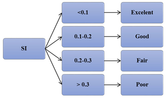The models were evaluated considering the criteria mentioned above, based on SI; each model was assessed as shown in Figure 16, which is adapted from [37]. For the R2 value, the best value is one; for the other statistical parameters, the lower the value, the better the model would be. The RMSE values of the models were compared; a lower value of RMSE and higher R2 jointly indicate better prediction amongst the models.
