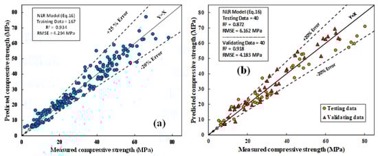Correlations between tested and forecasted CS of FA-based geopolymer mortar using NLR model; (a) training data; (b) testing and validation data.