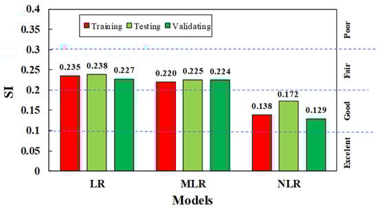 - The SI value of the NLR model for all three phases (training, testing, and validation) was between 0.1 and 0.2, indicating good performance of the NLR model, the SI value being 44 and 41% lower than the LR and MLR model’s SI values, respectively.