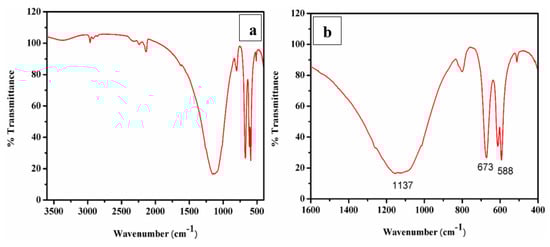 A typical FTIR spectrum of CaO derived from ISA is shown in Figure 9a,b. The minor band near 3400 cm−1 in the spectra was attributed to the (-OH) stretching vibration and bands near 2200–2400 cm−1 were attributed to the adsorbed atmospheric moisture and carbon dioxide and the formation of Ca(OH)2. As the CaO molecule is highly hygroscopic, it absorbs water very quickly [72]. The band at 2509 cm−1 is due to the carbonate peak [73] and a small band at 3654 cm−1 is due to the OH molecule. The broad band around 1400–1498 cm−1 indicates a symmetric stretching vibration due to the carbonation of CaO by the adsorption of atmospheric CO2. A small band at 870 cm−1 demonstrates the presence of carbonate species, and a tiny band at 560 cm−1 indicates vibrations of the Ca-O bond. The broad band with a peak centered at 1137 cm−1 indicates a symmetric stretching vibration due to the carbonation of CaO by the adsorption of atmospheric CO2 [74]. The small band at 865 cm−1 was attributed to the symmetric stretching vibration of the C-O bond and the presence of carbonate species [75].