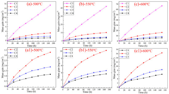 Mass gain of C1–C4 corroded in reducing atmosphere for 168 h at 500–600 °C as a function of time: (a) 500, (b) 550, (c) 600, (a1) 500, (b1) 550, and (c1) 600 °C.