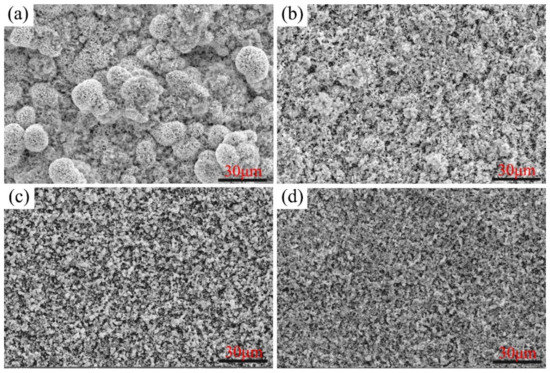 SEM micrographs of Ni–xCr–Mo coatings with varying Cr contents: (a) C1, (b) C2, (c) C3, and (d) C4.