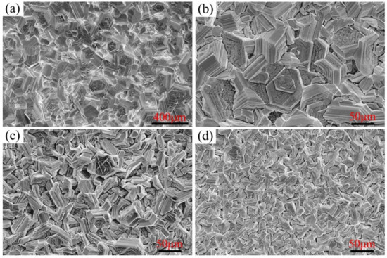 The surface morphologies of Ni–xCr–Mo laser-cladding layers corroded for 168 h at 600 °C are illustrated in Figure 8, which displays that the surface morphology observed at 600 °C was similar to that detected at 550 °C—composed of block corrosion products. However, the size of the corrosion block at 600 °C was larger than that at 550 °C. Overall, the corrosion surfaces of C1, C2, and C3, as depicted in Figure 8a–c, respectively, were covered by the corrosion products. Nonetheless, the gaps between the corrosion blocks enlarged when the Cr content reached 25 wt.%, as portrayed in Figure 8d.