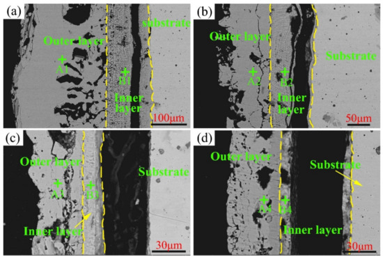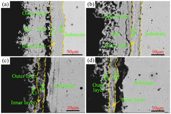 To better understand the influence of the Cr content on the corrosion resistance of Ni–xCr–Mo laser-cladding coatings, the cross-section morphology after the high-temperature sulfur test at 500–600 °C was observed under the back-scattered mode. As depicted in Figure 9, a two-layer structure, including an outer and inner layer of the corrosion scales, can be observed in C1–C4. The element composition of various sublayers is presented in Table 4. As indicated in Figure 9 and Table 4, the major elements in the outer layer included Ni and S, whereas the predominant elements in the inner layer were Mo, Cr, and O, which shows that Cr is enriched to the metal matrix during the corrosion process, which is consistent with the analysis results of Cr in steel [30,31]. Upon combining with the XRD patterns displayed in Figure 5, the main phase of the outer layer was determined as NiS and that of the inner layer involved the complex oxides of Mo and Cr. The black gap shown in Figure 9c,d between the corrosion scale and substrate was primarily caused by the separation of the corrosion layer during the SEM sample-preparation process.
