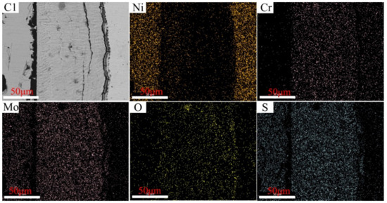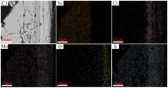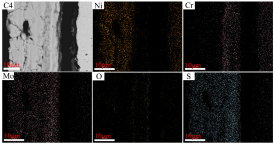 As depicted in Figure 12, Figure 13, Figure 14 and Figure 15, the element Ni enriched the outer layer, whereas the element Cr enriched the inner layer. More importantly, the Cr content in the inner layer increased with that of the Ni–xCr–Mo laser-cladding coatings, which was consistent with the EDS atomic fraction listed in Table 5. As shown in Figure 15, the Ni content in the inner layer of C4 was slightly lower than that of C1 (Figure 12), which was also confirmed in Table 5. This phenomenon indicated that a higher Cr content, for example C4, in the Ni–xCr–Mo laser-cladding coatings resulted in a denser inner layer containing Cr oxides, and the denser inner layer could prevent the Ni2+ from diffusing outward to react with the S2− and result in a lower corrosion mass gain (Figure 4). Consequently, the corrosion resistance of Ni–xCr–Mo laser-cladding coatings increased with the Cr content.