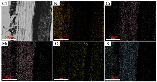 EDS maps of C2 cross-section after the sulfur corrosion test at 550 °C for 168 h.