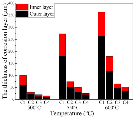 The thickness variation of the outer, inner, and total corrosion layers of Ni–xCr–Mo laser-cladding coatings after conducting the corrosion tests at 500–600 °C is exhibited in Figure 16, which depicts that the total thickness of the corrosion scales increased with the corrosion temperature. For the same corrosion temperature, the thickness of the outer and inner layers decreased with the increasing Cr content. As Cr content increased from 10 to 25 wt.%, the thickness of the inner and outer layers prominently decreased, which implied a significant improvement in the corrosion resistance of the material. This phenomenon is consistent with the kinetic curve fitting law reported in Table 7 and is evidence that a higher Cr content results in a lower corrosion rate.