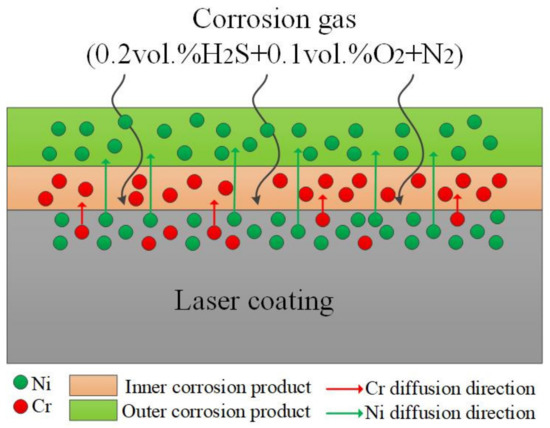 During the corrosion process, the Cr element gradually accumulated in the inner layer and formed the dense Cr-based corrosion products on the matrix surface. Moreover, the diffusion direction of the Ni2+ is from inward to outward, passing through the dense corrosion product layer and forming a loose Ni-sulfide corrosion layer above the dense corrosion product layer, as graphically illustrated in Figure 17. Therefore, the diffusion rate of Ni2+ in the dense corrosion layer is a vital aspect influencing the corrosion rate. Based on the above discussion, the linear corrosion curve for a Cr content of 10 wt.% implies that the corrosion layer formed on the matrix surface during the corrosion process cannot curtail the diffusion of the Ni2+, which can still effortlessly pass through the inner corrosion layer to contact the external corrosion gas and generate vulcanized objects. This finding revealed that the laser coating did not deliver appropriate corrosion performance for a Cr content of 10 wt.%.