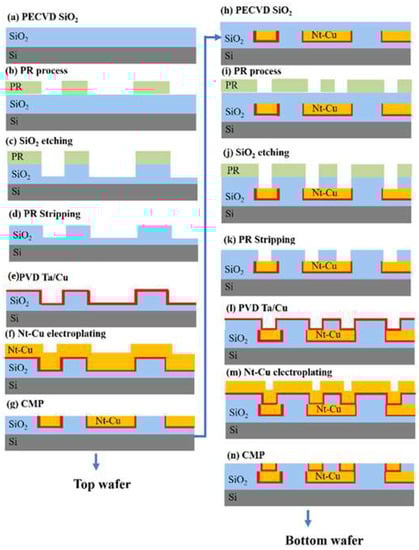 The bonding schemes are 12-inch wafer-to-wafer. Initially, we fabricated 20 μm pitch Cu bumps with Cu redistribution layer (RDL) on top wafers and Cu RDL/microbumps on bottom wafers. Figure 1a–g displays the schematic processes for preparing the top wafers. A SiO2 film with 2 μm in thickness was initially deposited by plasma-enhanced chemical vapor deposition (PECVD, AMAT Producer SE, Applied Materials, Santa Clara, CA, USA), followed by lithography(SUSS Aligner MA300, SUSS MicroTec SE, Garching, Germany) and etching to define patterns. A Ta/Cu seed layer was deposited by physical vapor deposition. Highly (111)-oriented nt-Cu with 2 μm thickness was electroplated with bottom wafer fabrication, additional Cu vias measuring 8 μm in diameter were fabricated on the Cu RDL. Finally, by using chemical mechanical planarization (CMP, AMAT Reflexion LK Applied Materials, Santa Clara, CA, USA), the co-planarized nt-Cu/SiO2 surfaces were obtained, as depicted in Figure 1h–n.