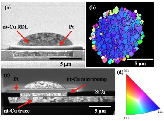 The microstructures of the Cu pads after the CMP process were analyzed by FIB and EBSD. Figure 3a shows the cross-sectional FIB image of nt-Cu RDL on the top die before bonding. No obvious dishing was observed. The Pt layer was deposited to avoid damaging the Cu in the FIB during ion cutting. The plan-view EBSD shows 78% of the via surface is (111)-oriented grains, as shown in Figure 3b,c depicts the cross-sectional FIB for the nt-Cu microbump on the nt-Cu trace in the bottom die. The inverse pole figure is shown in Figure 3d. The nt-Cu trace was designed for the measurement of electrical resistance of the Cu-Cu joint.