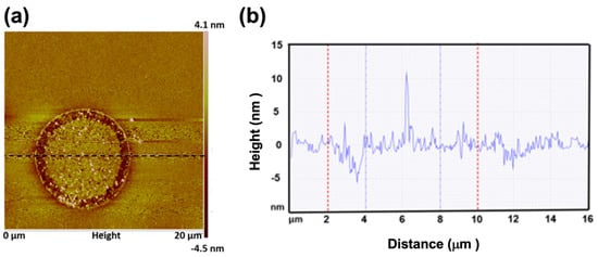 To facilitate hybrid bonding, the surface roughness of Cu and SiO2 need to be reduced by CMP to a few nanometers. Figure 4 shows the typical AFM results for a Cu via surrounded by SiO2 dielectrics. The root mean square averages of the individual heights and depths from the mean line (Rq) were measured for the Cu and SiO2 surface as 1.65 and 0.5 nm in average of six samples each, respectively. It is worth noting that the nt-Cu has a high hardness of 2.2 GPa, which minimizes the dishing after a CMP process. As shown in Figure 3a and Figure 4, the dishing/recess is quite uniform and can be controlled within 3 nm, which is good for bonding with a better interface geometry.