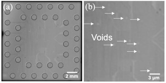 (a) CSAM results for bonded dies showing more than 95% areas are well bonded. (b) Enlarged image of bonded area with small voids indicated by pointed arrows.