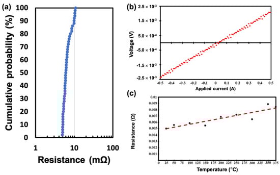 (a) Measured cumulative resistance for single Cu-Cu joint by four-point probes; (b) I–V curves; (c) Resistance against measured temperatures from 25 °C to 375 °C.