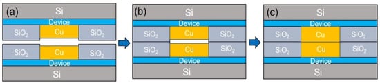 The mechanism for the Cu/SiO2 hybrid bonding is described below. The key step for the hybrid bonding is to control the height and shape of the Cu recess precisely. Figure 8 illustrates the schematic diagram for the hybrid bonding mechanism. After the CMP process, the height of the Cu via should be slightly lower than the surrounding SiO2 film, as shown in Figure 8a. The top and the bottom Si wafers are aligned face-to-face and compressed at room temperature to bond the top and the bottom SiO2 films first, as depicted in Figure 8b. Then, the bond wafers are heated to a suitable temperature without external pressure to further strengthen the SiO2 and SiO2 bonding, as well as to accomplish the Cu-Cu bonding, as seen in Figure 8c. The compressive stress needed to trigger the Cu-Cu bonding is generated internally by the difference in CTE mismatch between the PECVD SiO2 and Cu. It is reported that the PECVD SiO2 possesses a CTE value of 4.4 × 10−6/°C [30]; while it is 16.6 × 10−6/°C for Cu. During the heating process, the Cu expands more than the SiO2 does. Therefore, the upper and the lower Cu vias contact each other and compressive stress is created in the Cu vias. Then creep takes place in the contact interface of the Cu vias to achieve the Cu-Cu bonding [3,14].