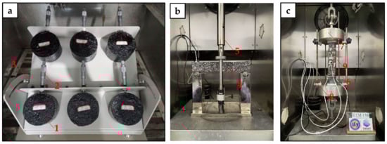 Setups of asphalt concrete slope flow test (a), three-point bending (3PB) test (b) and thermal stress restrained specimen test (TSRST) (c), where: 1—Marshall specimen; 2—Micrometer; 3—Tilt adjustable oblique panel.; 4—3PB specimen; 5—Loading device; 6—Temperature transducer; 7—Cohesive devices; 8—Displacement transducer; 9—TSRST specimen.