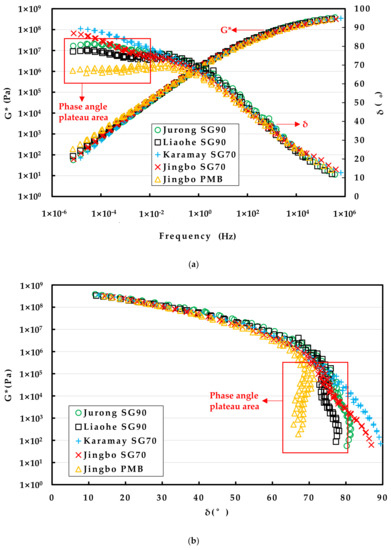 Figure 2b shows the black diagrams based on the complex modulus and the phase angle. The curves exhibited the relationship between the measured complex modulus and the phase angle on a semi-logarithmic scale. It can be observed that the complex modulus decreased as the phase angle increased for all of the hydraulic bitumen binders. Karamay SG70 bitumen exhibited a smooth decline tendency over a wide range of phase angles. However, the Jingbo SG70 hydraulic bitumen, Jurong SG90 hydraulic bitumen and Liaohe SG90 hydraulic bitumen exhibited a slight deviation from the smooth trend. A distinct deviation can be found for Jingbo PMB. The complex modulus dropped dramatically as the phase angle remained in a plateau between 60° and 70°. It should be noted that the existence of the phase angle plateau is believed to be attributed to the addition of polymer into bitumen. Again, the degree of the plateau demonstrated that the Jingbo SG70 hydraulic bitumen, Jurong SG90 hydraulic bitumen and Liaohe SG90 hydraulic bitumen were slightly modified by a smaller amount of polymer when compared with real Jingbo PMB.
