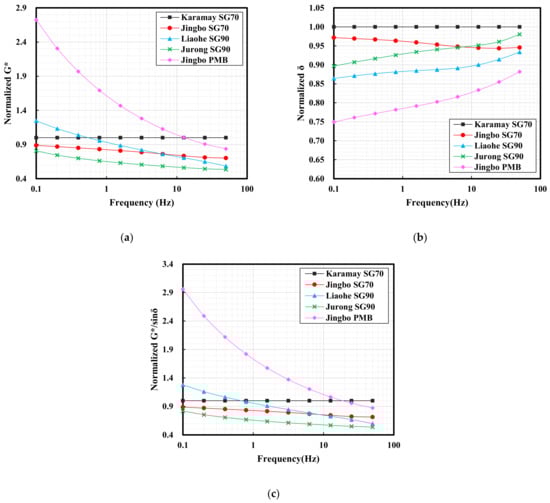 As can be seen in Table 4, all the bitumen binders exhibited an increase on G* with a reduction on δ as the test frequency increased. These changes seemed to be dependent on the type of bitumen. The Karamay SG70 bitumen had a phase angle of 89.4, indicating that it is close to Newtonian fluid at 70 °C. For the ease of comparison, the Karamay SG70 bitumen was selected as the reference bitumen, since it is commonly accepted and used as a hydraulic bitumen in China. The G* and δ obtained from other bitumen binders were normalized using the Karamay SG70 bitumen as the reference value of 1 at various frequencies. To do this, the G* and δ of other bitumen binders were divided by the corresponding value of the Karamay SG70 bitumen and the obtained ratios were illustrated in Figure 3. Similarly, the values of G*/sinδ were also normalized.