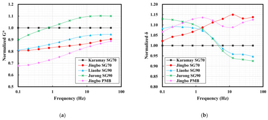 As can be seen in Table 5, all the bitumen binders exhibited an increase on G* with a reduction on δ as the test frequency increased. With a frequency higher than 25 Hz, some bitumen binders tended to have a complex modulus higher than 300 MPa together with a phase angle lower than 15°. This indicates that the rapid temperature drop is decisive for thermal cracking at low temperature. Similarly, the G* and δ were normalized using Karamay SG70 bitumen as the reference, as mentioned before, and the obtained results were presented in Figure 4.