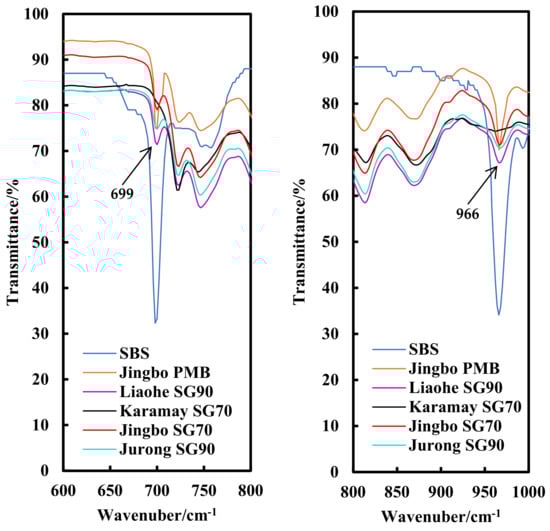 Fourier transform infrared spectroscopy (FTIR) analysis is a commonly used technology to monitor the molecular changes associated with bitumen oxidation and aging [24]. Carbonyl groups and sulfoxides are the major functional groups formed during bitumen oxidative aging. Both can be well identified by C=O at 1700 cm−1 and S=O at 1030 cm−1, respectively, in FTIR spectroscopy. For SBS polymer-modified bitumen binders, the SBS polymer consists of a polybutadiene segment in the middle with polystyrene blocks at the ends, which contains the C=C bonds in the unsaturated carbon chains and benzene rings, respectively. Two special absorption peaks at 966 cm−1 and 699 cm−1 can identify the polybutadiene (PB) and polystyrene (PS), respectively, and thus they can be used to characterize the existence of SBS in its modified asphalt binder with FTIR spectroscopy [25,26]. Furthermore, the degradation of the SBS polymer during binder aging can also be detected. In this paper, interest is focused on the detection of the existence of the SBS polymer, while the effect of aging will be analyzed in future studies.