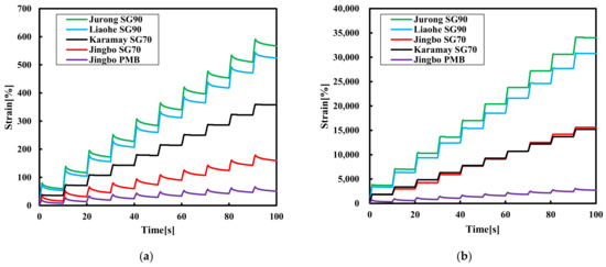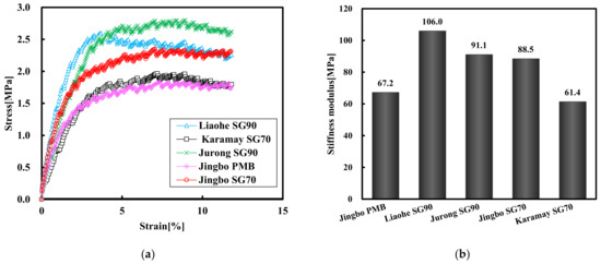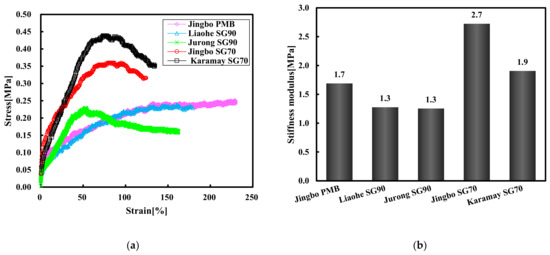 Figure 10 shows the tensile stress–strain curves and the stiffness modulus of the five hydraulic bitumen binders at −15 °C. At −15 °C, all of the five hydraulic bitumen binders exhibited ductile failure, and thus had the maximum stress strains larger than 10%. With respect to the stiffness modulus, the Liaohe SG90 bitumen had the largest stiffness, followed by the Jurong SG90 and Jingbo SG70 bitumen. The Jingbo PMB and Karamay SG70 bitumen had the smallest stiffness modulus. In general, the Karamay SG70 bitumen showed very similar properties with Jingbo PMB. This indicated the former had a superior property compared to the rest of the bitumen binders.