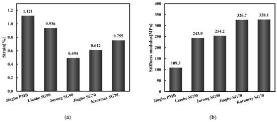 Figure 11 shows the tensile strain at failure and the stiffness modulus of the five hydraulic bitumen binders at −25 °C. Under the test condition of −25 °C, all five hydraulic bitumen binders showed brittle failure. The failure strain of Jingbo PMB was the largest, followed by the Liaohe SG90 bitumen, the Karamay bitumen and the Jingbo SG70 bitumen; the Jurong SG90 bitumen had the smallest failure strain. From the analysis of the stiffness modulus, it can be seen that Jingbo PMB was the smallest, followed by the Liaohe SG90 bitumen and the Jurong SG90 bitumen. Both the Jingbo SG70 bitumen and the Karamay bitumen had a relatively high stiffness modulus.