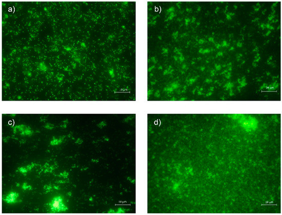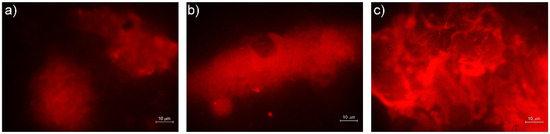 The sessile bacterial population, adherent on composite disks, was washed with 1 mL of PBS twice, stained with 500 μL of the rhodamine-conA (10 μg/mL) solution, and incubated in the dark at room temperature for 30 min. Then, the excess staining solution was removed, and the stained specimens were rinsed with 1 mL of PBS and examined under fluorescence Leica 4000 DM microscope (Leica Microsystems, Milan, Italy). The fluorescence microscopy was used to obtain images using an excitation of 514 nm and an emission wavelength of 600 ± 50 nm. For this detection, 9 disks (3 for each different CR material) were analyzed in triplicate, for a total of 27 disks.