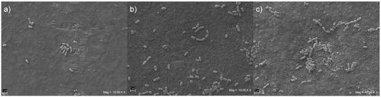Representative SEM images (10.00 KX) of Streptococcus mutans biofilm formed on disk-shaped specimens from VOCO (a), VD (b), and ES2 (c) groups.