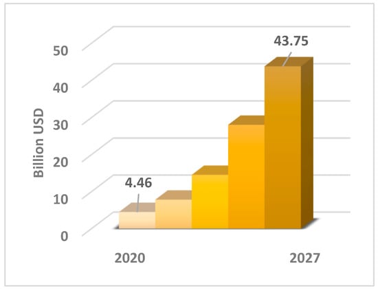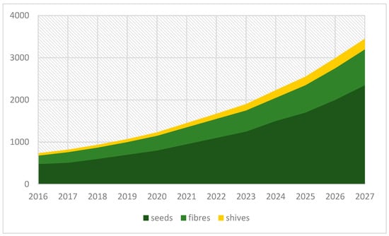 All the arguments listed above have resulted in rising global interest in hemp cultivation and use, as well as predictions about the growing hemp market size in the future. Figure 1 shows the forecast picture for the U.S. industrial market size during the period from 2016–2027.