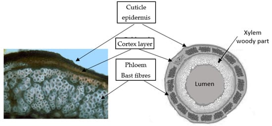 The stalk of a matured hemp plant is made up of several layers, which is illustrated in Figure 5. The cuticle/epidermis is the outside layer which protects the cells of the stalk against moisture evaporation and sudden temperature changes, as well as partly giving mechanical reinforcement to the stem. The epidermis consists of colour-binding media and stomata (pores), through which the plant ventilates and regulates evaporation [14].