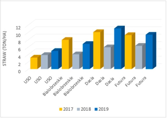 Mean straw yield determined for different type of hemp cultivars: USO 31, Dacia Secuieni, Bialobrzeskie, Futura 75, cultivated for three consecutive years, based on [47].