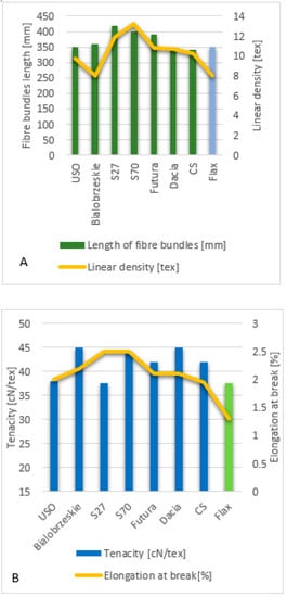 Fibre bundle quality parameters: (A)—fibre bundle length vs linear density, (B)—elongation at break vs tenacity. Tested hemp variety: USO 31, Bialobrzeskie, Santhica 27, Santhica 70, Futura 75, Dacia Secuieni and Carmagnola Selezionata [47].
