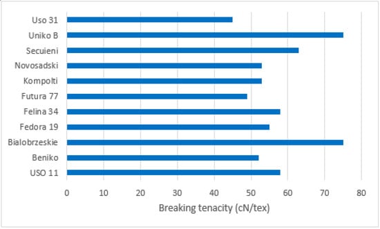 Breaking tenacity of the fibres (cN/tex) measured for 12 fibre samples of each cultivar in 1996, based on [48].