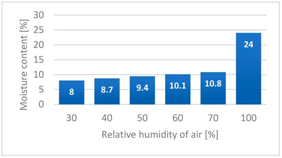 Hemp fibres show a high ability for moisture sorption from surrounding areas, similar to other hydrophilic cellulosic materials [19]. The amount of bonded moisture by bast fibres depends on the surrounding air humidity. The values of hemp fibre moisture content in relationship to relative humidity of air is presented in Figure 15 [51].