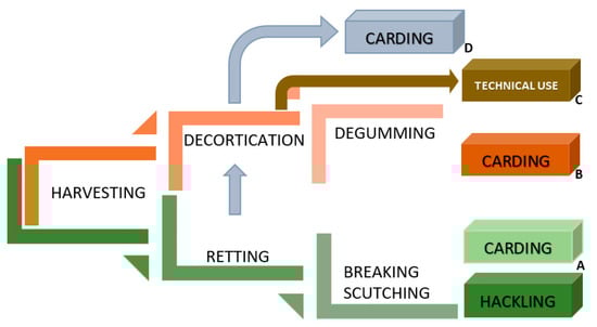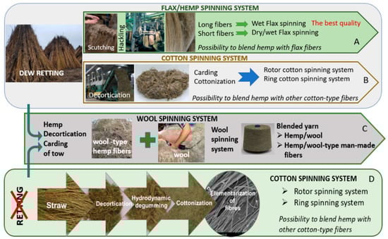 The multilateral approach to hemp fibre extraction presented in Figure 16A–D shows the possibilities of applying different tracks of the value chain. Retting, the first process of fibre extraction, determines fibre quality. The main idea of the process is the biological degradation of pectin and other cementing compounds such as hemicellulose and lignin that bind the bast fibres and fibre bundles to other stalk tissues and, thereby, separate fibres from non-cellulose materials [61,62,63,64]. A historically well-known method of fibre extraction from the hemp straw was the water retting process [65], which, due to high toxicity to the environment has been replaced by dew retting. However, during the last few decades, the new water retting methods have been developed with respect for environmental protection [66,67]. The relatively younger retting methods are enzymatic retting [68] or osmotic degumming [69]. Regardless of the applied method, after the retting, it is necessary to conduct mechanical processes such as breaking and scutching to separate the fibres from the woody parts and divide the technical fibres into smaller fibre complexes (Figure 16A). Scutched long fibres used for high quality textile production are further processed on a hackling machine. Short fibres created during scutching have to be carded to prepare thicker yarns for thick fabrics, for example, upholstery, and other woven applications, as well as raw materials for nonwovens and technical products.