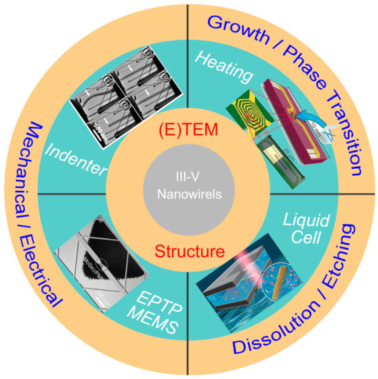 In situ microscopy techniques has provided us powerful tools to reveal the underlying structural evolution under various external stimuli, [9,10] which are introduced through various holders used in the transmission electron microscope (TEM) holder and microelectromechanical system (MEMS) chips (Figure 1) [11]. In situ heating stages have been frequently used to investigate the growth mechanisms, the droplet/ nanowire (NW) interface dynamics and the metal/NW contact formation mechanisms. With a liquid cell, the dissolution and etching behavior of III–V materials under various environments can be dynamically evaluated. The mechanical and electromechanical properties of III–V materials is quite important for their practical applications, while a method of correlating these properties with their morphology and structure remains quite challenging. The development of in situ TEM technique provides solutions to realize the structure–property relationship. With the combined in situ techniques, the III–V materials have been investigated at the atomic level from synthesis to applications.