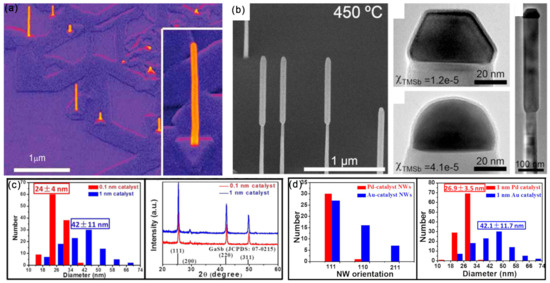Epitaxial III–V semiconductor NWs have attracted much attention due to their potential applications in electronics and optoelectronics [20,21,22,23]. Both “top-down” and “bottom-up” methods have been utilized to synthesis III–V NWs. For the “top-down” method, photolithography and etching are frequently applied to fabricate NWs from their bulk counterpart, while the further scale-down of NWs is limited. For the “bottom-up” process, III–V NWs are epitaxially grown on substrate from atoms and molecules with the VLS and VSS mechanisms, according to the state of seed particles during the growth process. The metal catalyst particle is regarded as one of the most important factors influencing the structure and morphology of NWs. Au catalysts have frequently used in the epitaxial growth of GaAs (Figure 2a), [24] GaSb (Figure 2b) [25] and InAs NWs. Except for the frequently used Au NPs, Pt, Ag and Cu have also been used as seed particles for the epitaxy growth of III–V NWs [26,27,28,29]. The physical properties of III–V NWs are closely related with their growth orientation, phases and diameters; thus, the controlled synthesis of III–V NWs is quite important.