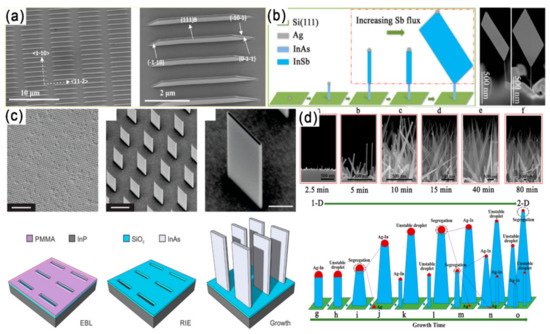 Later, the growth of free-standing InSb nanosheets on 1D InAs NWs through MBE on a Si substrate is proposed (Figure 5b) [62]. The morphology and size of free-standing InSb nanosheets can be controlled in the approach by tailoring the Sb/In beam equivalent pressure ratio and InSb growth time. Through this growth mechanism, pure ZB single crystal InSb nanosheets with length and width up to several microns and thickness up to 10 nm were synthesized. The above mentioned InSb nanosheets are epitaxy on InAs stems. In 2019, Sasa Gazibegovic et al. grew InSb nanosheets directly from a InSb substrate platform without any foreign stem formation [64]. With a SiOx dielectric template fabricated by a mask transfer process by the plasma-enhanced CVD, the rectangular InAs nanofins with definite length, width and height can be synthesized at the rectangular opening using the MOCVD method (Figure 5c) [63]. By controlling the In flux, the morphology of InAs can be adjusted from 1D NWs to 2D nanosheets (Figure 5d) [28].