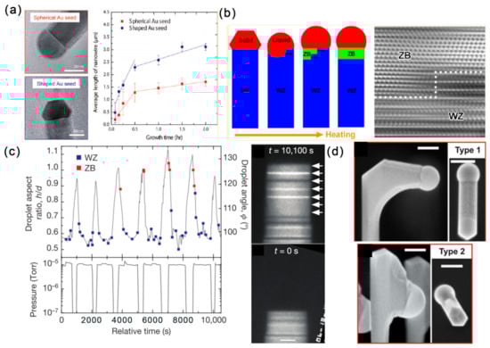 Influence of droplet NPs on the growth of III–V NWs. (a) Relationship between the average length and growth time of InAs NWs grown with spherical and shaped Au seed particles. Reproduced with permission [67]. Copyright 2012, American Chemical Society. (b) Role of Au particles in tailoring the nucleation and phases of InAs NWs at the liquid/solid interface. Reproduced with permission [68]. Copyright 2013, American Chemical Society. (c) Growth of a WZ GaAs NW containing multiple narrow ZB by controlling the AsH3 pressure and the droplet morphology. Reproduced with permission [69]. Copyright 2016, Macmillan Publishers Limited. (d) Side- and top-view images of type 1 horizontal and type 2 downward-grown self-catalyzed GaAs NWs. Reproduced with permission [70]. Copyright 2019, American Chemical Society.