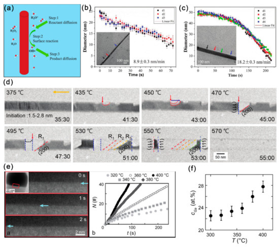 Understanding the structural transformation of III–V nanostructures at high temperatures and in chemical environments is quite important for both science and technology in many fields. For their applications involving a liquid phase process, the recently developed liquid cell technology provides us an effective approach to in situ observe the liquid phase reactions through TEM. The III–V NWs have shown promising applications in high-performance electronic devices, while their surface-native oxide layer can greatly affect their physical properties, and wet-chemical etching has been frequently applied to remove the oxide layer and passivate the surface. Therefore, revealing the dissolution kinetics of III–V NWs is key for the precise control of the etching process. The high-energy electron beam irradiation of water can excite reducing and oxidizing radicals, which can etch InAs NWs (Figure 7a) [13]. The InAs NWs in the radiolytic deionized water presented an unexpected constant dissolution rate (Figure 7b). It should be mentioned that the MOCVD-grown InAs NWs presented delayed dissolution (Figure 7c) with higher dissolution rates than the MBE-grown NWs. This could be caused by the unintentional carbon doping and dense stacking faults of MOCVD NWs. The dissolution kinetics of constant speed InAs NW dissolution in radiolytic water is found to be surface-reaction limited dissolution, and the reaction activation energy should be constant during the whole dissolution process.