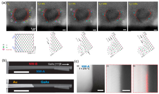 Due to the unique optical and electrical characteristics, III–V semiconductors have been recognized as the extension of Moore’s Law and have shown broad application prospect in infrared light detection [1,2], quantum computation [3], gas sensing [4], etc. [5,6]. The excellent electron transport and superior mobility presented by III–V nanomaterials [7,8] further benefit their applications in high-speed electronics. Vapor–liquid–solid (VLS) and vapor–solid–solid (VSS) mechanisms are frequently applied in the controlled synthesis of various III–V nanostructures. III–V nanomaterials generally present zinc blende (ZB), wurtzite (WZ) or mixed (ZB/WZ) phases, depending on the synthesis conditions. Due to the lack of direct insights during the growth process, the growth processes are generally investigated through post-growth characterizations, while key information related to the morphology and composition evolution of catalysts, phase selection and formation dynamics remains debatable. Thus, understanding the growth and phase transformation mechanisms during the growth process is quite essential for the controllable synthesis of III–V nanostructures. Recent investigations showed that their physical properties like electrical, mechanical, and optical properties are closely related to morphology, phase, and orientation. Therefore, revealing the structure–property relationship is quite important for the design and fabrication of high-performance devices.