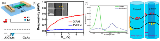 - Zhu, X.; Lin, F.; Zhang, Z.; Chen, X.; Huang, H.; Wang, D.; Tang, J.; Fang, X.; Fang, D.; Ho, J.C.; et al. Enhancing performance of a GaAs/AlGaAs/GaAs nanowire photodetector based on the two-dimensional electron-hole tube structure. Nano Lett. 2020, 20, 2654–2659. [Google Scholar] [CrossRef]