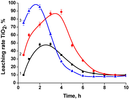 Figure 6). When using 25% HCl during the boiling of the reaction mixture for 2.5 h, the degree of titanium (IV) transition to the hydrochloric acid liquid phase does not exceed 60%, after which time the titanium precipitate begins to form. With an increase in the concentration to 30 and 35% HCl, the degree of the titanium (IV) transition noticeably increases and reaches 93% and 96%, respectively. In these cases, the leaching rate (before the formation of the titanium precipitate) is higher in the case of 35% HCl. In all cases, the titanium (IV) is almost completely precipitated after a process duration of 10 h. The titanium–silicon precipitate (TSP) isolated during the decomposition of the SC was then washed with water to remove the hydrochloric mother liquid. Calcium was concentrated in the hydrochloric acid liquid phase, during which evaporation removes the free hydrochloric acid and crystallizes the precipitate in the form of calcium chloride.