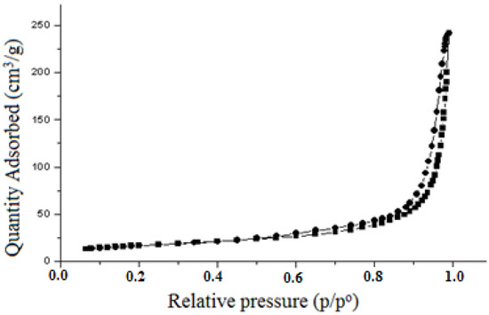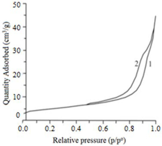 One of the factors determining the sorption activity of a material is its porosity. According to the results obtained, the adsorption-desorption isotherm has a hysteresis loop in the region of relative pressure of 0.4–0.6, which is typical for planar particles and is a combination of H1 and H3 types according to the IUPAC classification (