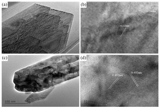 Figure 2 shows the HR-TEM images depicting the morphology and lattice fringes of the transformed products after the reaction of n-Fe/Ni with p-CNB for 8 h. In Figure 2a,c, the morphology of the iron hydroxides in the shape of a lath (Figure 2a) and needle (Figure 2c) can be clearly observed. This is consistent with the TEM observations (Figure 1c). The measured crystal plane spacings of lath iron hydroxideare 0.246 nm and 0.323 nm (Figure 2b), which are in line with the crystal planes (120) and (031) of rhombic structured lepidocrocite. The measured crystal plane spacing of needle-rod iron hydroxide is 0.492 nm (Figure 2d). This is consistent with the (020) crystal plane of rhombic goethite. HR-TEM analyses further proved that the iron hydroxides formed by n-Fe/Ni reaction with p-CNB for 8 h are lepidocrocite and goethite.