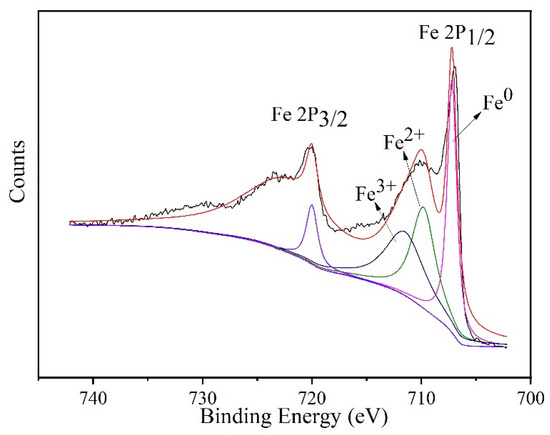 Figure 4 shows the XPS spectrum of n-Fe/Ni before the reaction with p-CNB. It can be seen that the peak representing Fe0 at 706.7 eV is higher, which further confirms that the main content in n-Fe/Ni (0h) is Fe0. The intensity of the two peaks at 709.8 and 711.5 eV is relatively weak, indicating that only a small amount of iron exists in the forms of Fe2+ and Fe3+.