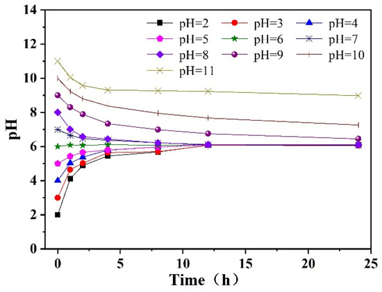 A number of 200 mL p-CNB solutions with a concentration of 10 mg/L were taken. The pH of the solution was adjusted to 3, 4, 5, 6, 7, 8, 9, 10 and 11 with dilute HCl or NaOH; then, n-Fe/Ni was added to the solution at a dose of 2.5 g/L. The variation in pH during the reaction is shown in Figure 5. As can be seen from Figure 5, when the initial pH was ≤ 6, the pH of the solution increased with the extension of the reaction time and rose to about 6.0 after 28 h. When the initial pH of solution was 7, 8 and 9, the final pH of the solution decreased to between 6.1 and 6.4 afer 28 h. However, when the initial pH was 10 and 11, the pH of the solution decreased to 7.7 and 8.8 after 28 h of reaction, respectively. The reason may be that in the reaction between Fe0 and p-CNB, both H+ consumption and H+ generation occur (see Equations (1)–(6)). When initial pH was ≤ 6, H+ consumption was dominant; however, when initial pH was > 6, H+ generation prevailed. Since the pH of the reaction was stable at around 6 for all initial pH conditions (except for initial pH 10 and 11), no buffer solution was employed to maintain the pH of the solution during the reaction.