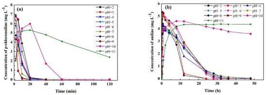 The influence of pH on the coupling removal of p-CNB, p-CAN and AN by n-Fe/Ni-FeOOH is shown in Figure 6. It is prudent to include that the p-CNB was quickly converted to its reduced form (p-CAN) within 2 min (except at pH 10 and 11) of reaction with the n-Fe/Ni. Therefore, the curve of the change in the concentration of p-CNB is not shown.