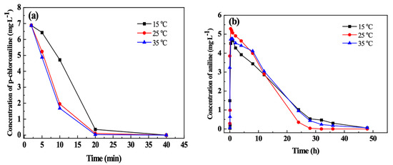 Figure 7 indicates the effect of temperature on the coupling removal of p-CAN and AN by n-Fe/Ni-FeOOH. It can be observed from Figure 7a that there is a positive proportional relationship between temperature and the dechlorination of p-CAN by n-Fe/Ni. The reason is that the mass transfer rate in the reaction system accelerates with the increase in temperature and promotes dechlorination [31]. In addition, the changes in temperature lead to changes in the concentration of the dissolved oxygen (Table 1). Specifically, there is a negative correlation between the temperature and the solubility of oxygen in water, which is not conducive to the formation of the passivation layer on the n-Fe/Ni surface. Therefore, the active site of the Fe0 on the n-Fe/Ni surface is fully utilized. Although the dechlorination rates are slightly varying with different temperatures, p-CAN is completely dechlorinated within 40 min by the n-Fe/Ni at 15, 25 and 35 °C. The test results illustrate that temperature has little influence on the dechlorination of p-CAN.